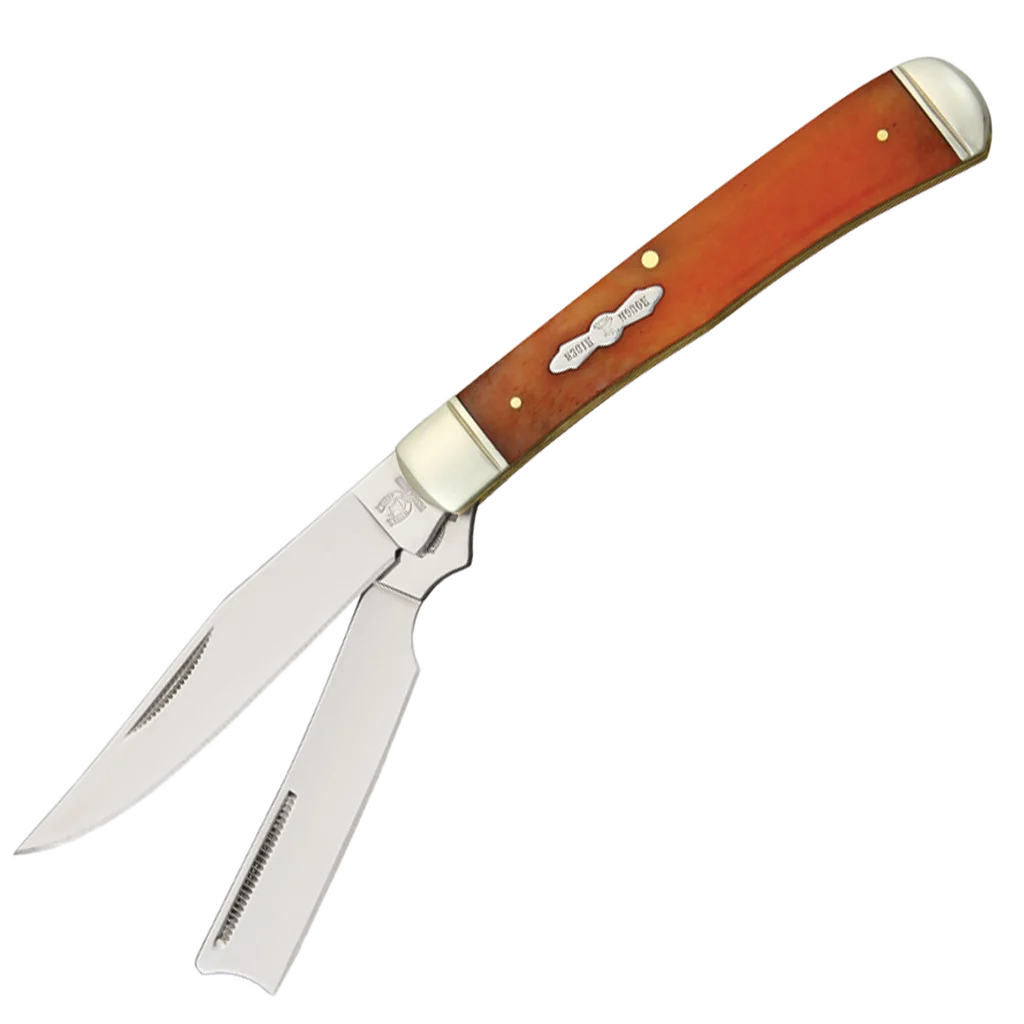 The Rough Ryder Razor Trapper – Orange Bone features 440A stainless steel blades with nail nick pulls and a satin finish. The handles are constructed from smooth orange bone with brass pins and liners, nickel silver bolsters, and a nickel silver Rough Ryder shield.