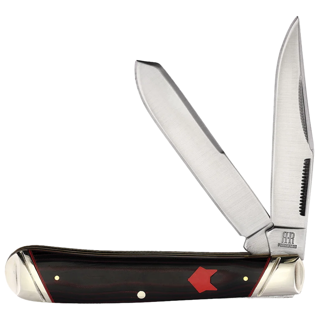 All the knives in the Rough Ryder Red Fox Series feature 440 stainless steel blades with nail nick pulls and a satin finish. The handles are warm black and red Micarta with a Red Fox Micarta shield, nickel silver pins and bolsters, brass liners, and red synthetic spacers.