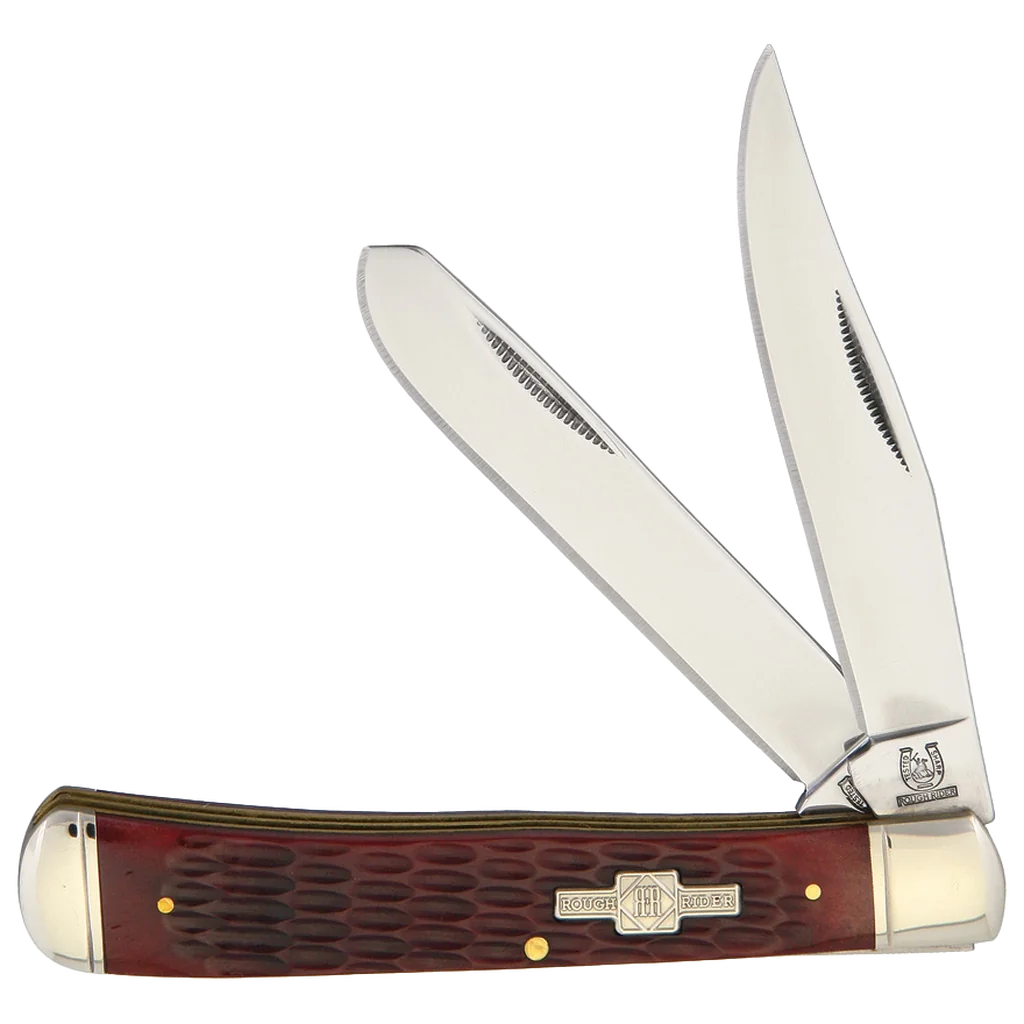 The Rough Ryder Red Jigged Bone Trapper features 3.12" 440A stainless steel clip point and spey blades with match strike pulls. The handles are red jigged bone with brass pins and liners, nickel silver bolsters, and a nickel silver shield. It's 4.12" closed.