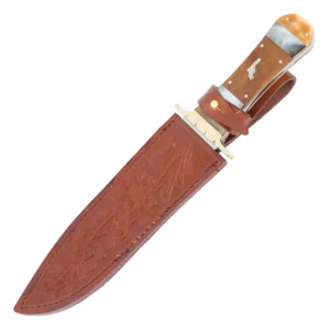 Take a trip back in time with the kind of knife you might have taken with you on trips to the woods. The Rough Rider Roy Rogers Bowie makes a great addition to any collection, especially one that evokes times gone by. The blade is stainless steel with a "Roy Rogers King of the Cowboys" engraving. The bolster is brass which leads the eye into the handle featuring bone and mother of pearl sections around the stainless tang. It is supplied with a leather sheath.