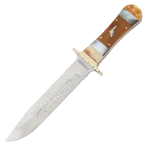 Take a trip back in time with the kind of knife you might have taken with you on trips to the woods. The Rough Rider Roy Rogers Bowie makes a great addition to any collection, especially one that evokes times gone by. The blade is stainless steel with a "Roy Rogers King of the Cowboys" engraving. The bolster is brass which leads the eye into the handle featuring bone and mother of pearl sections around the stainless tang. It is supplied with a leather sheath.