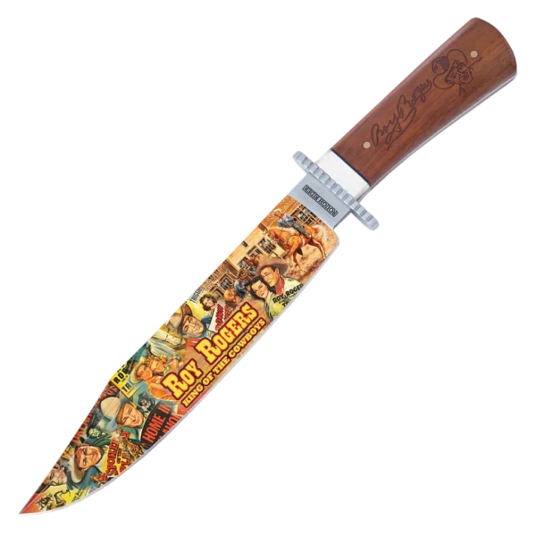 The Roy Rogers King of the Cowboys Bowie by Rough Ryder has full-colour artwork on the clip point blade with wood and natural bone handles. The blade is 440A stainless steel blade with full colour onlay on front depicting comic artwork. The handle natural bone and wood engraved with Roy Rogers likeness and signature. The guard is fileworked stainless steel and the knife is supplied with a nylon sheath. There is also a wood display plaque with nameplate to show off this impressive addition to any collection.