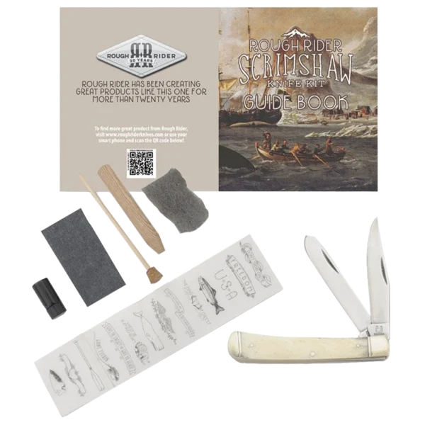 The Rough Ryder Scrimshaw Trapper Folding Knife and Kit is a great choice for anyone looking for a quality, affordable folding knife, and the tools to personalise it! The knife features a 440A stainless steel blade with a clip and spey blade style both with a mirror polished finish. The blade is 3.12 inches long and has a plain edge. The handle is made of bone and has a slip joint lock. The Scrimshaw kit includes an etching scribe tool, wooden stylus, India ink, cotton swabs, transfer paper, steel wool, pre-crafted designs, an instruction booklet, and a carrying pouch. It's 4.12" closed and weighs 4oz.