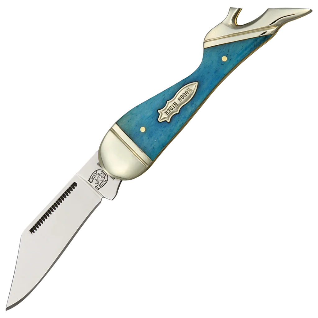 The Rough Ryder RR1269 is a beautifully crafted pocket knife that skilfully combines style and functionality. With a handle length of 3.25" it is compact and comfortable to hold, making it an ideal companion for various tasks. The knife is equipped with a high-quality stainless steel clip blade, which is known for its durability and corrosion resistance, ensuring long-lasting sharpness and reliability. The smooth blue bone handle adds a touch of elegance and uniqueness to the knife and reflects Rough Ryder's commitment to quality craftsmanship. The handle is complemented by nickel silver bolsters, which not only enhance the aesthetics of the knife but also provide additional strength and structural support. The handle also features a shield inlay, which gives the knife a distinctive character. The slipjoint mechanism offers a reliable and uncomplicated locking system that allows the blade to be opened and closed with ease.