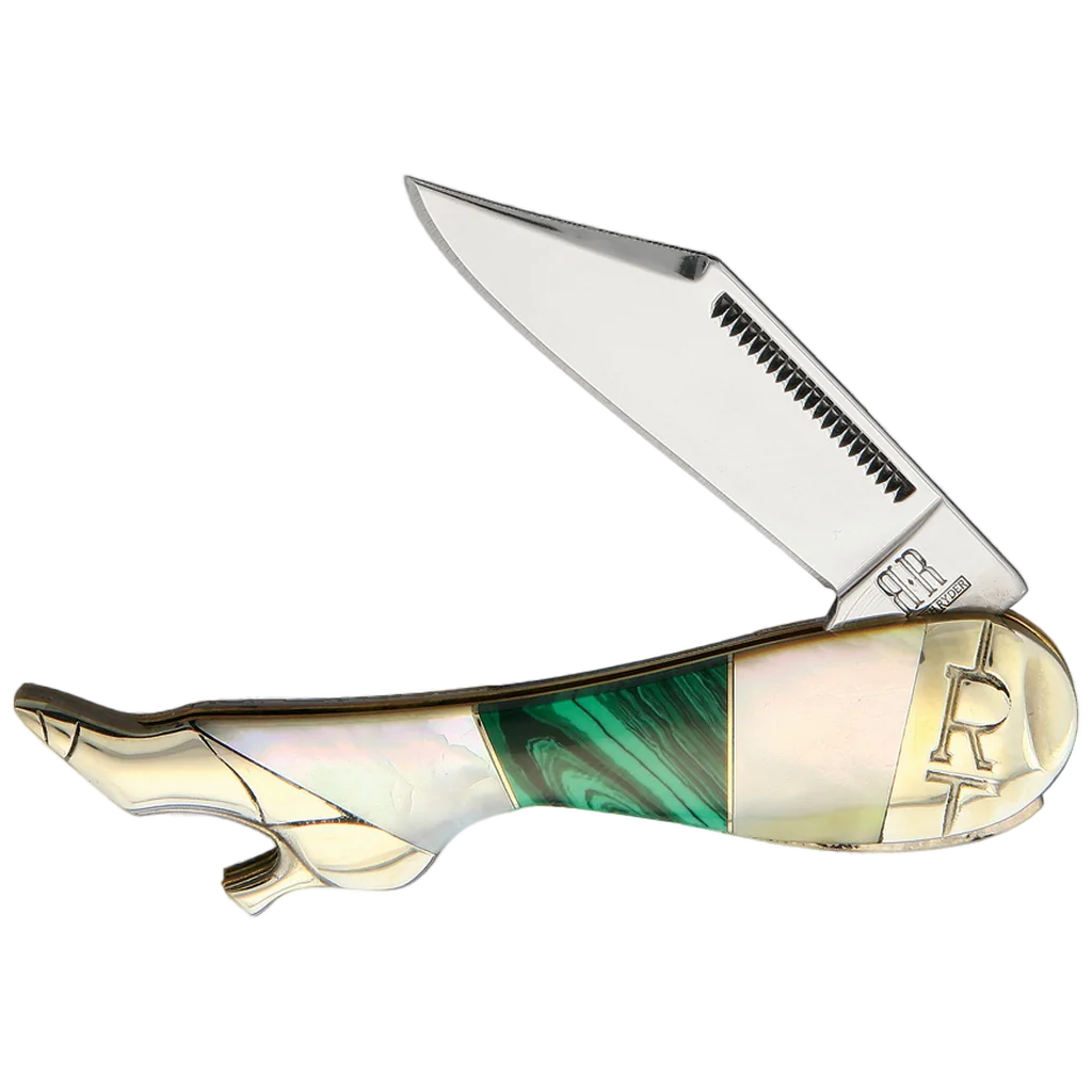 All the knives in the Rough Ryder Stoneworx Malachite Pearl Series feature mirror polished 440A stainless steel blades with match strike pulls. The handles are malachite and pearl with brass liners and embossed nickel silver bolsters. This Rough Ryder Stoneworx Malachite Pearl Small Lady Leg features a 2.12" clip point blade. It’s 3.25" closed and weighs 1.6oz.