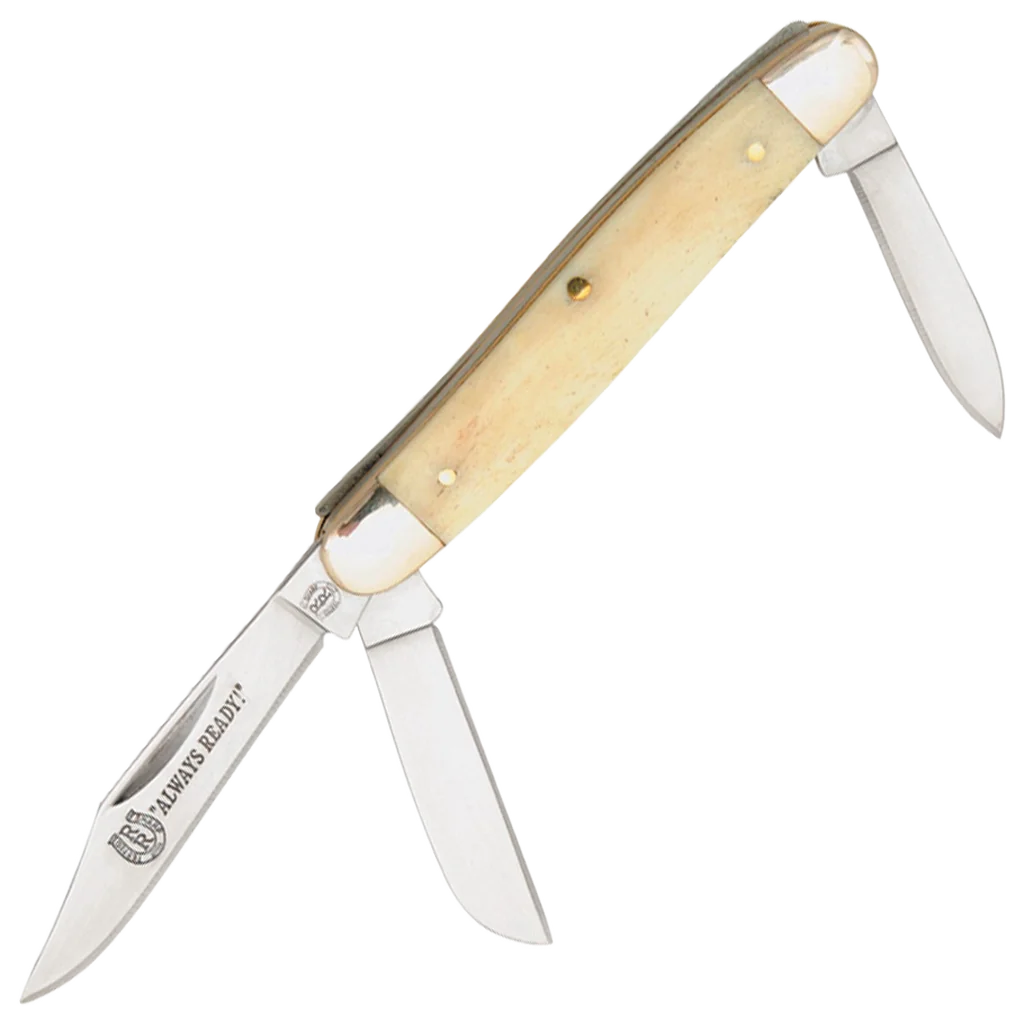 The Rough Ryder White Smooth Bone Small Stockman Folding Knife features 440A stainless steel mirror polish 2.5" clip point, 1.5" sheepsfoot, and 1.37" spey blades. The handles are white smooth bone with brass pins and liners, and ringed nickel silver bolsters. It’s 2.75" closed and weighs 1.28 oz.