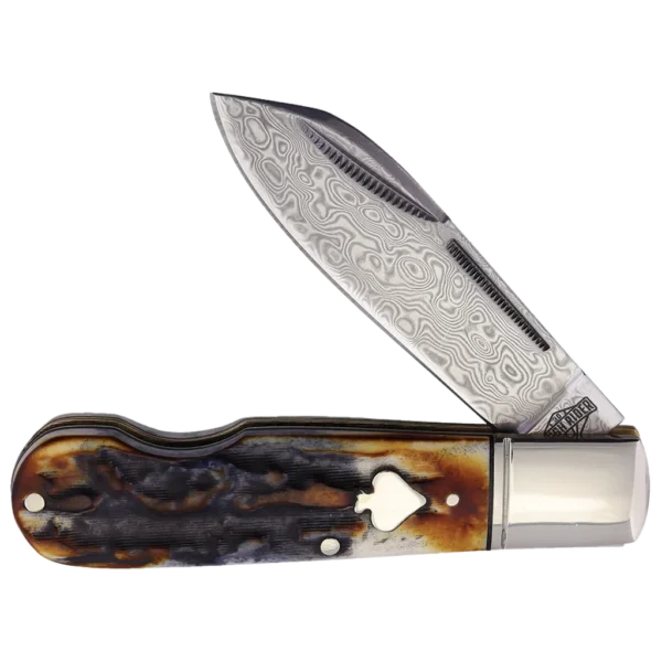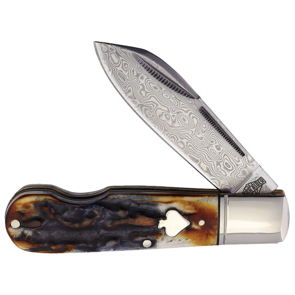 This Rough Ryder EZ-Open Jack folding knife has a beautifully layered Damascus steel blade with dual match strike pulls. The handles are jigged cinnamon bone with brass liners, nickel silver pins, ringed nickel silver bolsters, and a special spade-shaped nickel silver shield. It's 3.75" closed and weighs 2.5oz.
