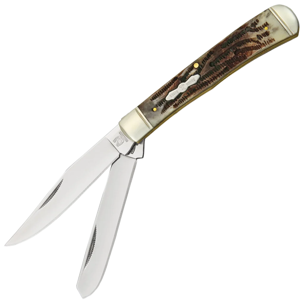 Introducing the Rough Ryder Stag Bone Trapper – a knife that combines classic design with robust functionality. Crafted for those who appreciate tradition and reliability, this knife is a testament to quality craftsmanship. The Rough Ryder Stag Bone Trapper features two 440A stainless steel blades: a clip point and a spey blade, both with a satin finish that enhances their corrosion resistance and durability. These blades are designed for a variety of tasks, from precision cutting to general utility. The match strike pulls add a touch of nostalgia and practicality, making it easy to open the blades in any situation. The handle is crafted from genuine stag bone, giving each knife a unique and rugged appearance. Stag bone not only provides a comfortable and secure grip but also adds to the knife's aesthetic appeal. The handle is complemented by brass pins and liners, which offer additional strength and stability to the overall construction. Nickel silver bolsters provide a polished look while enhancing durability, and the nickel silver inlaid shield is a mark of authenticity and quality. Measuring 4.12 inches when closed and weighing 4 ounces, this trapper is compact enough for everyday carry yet substantial enough to handle tough tasks. Its balanced weight and ergonomic design make it comfortable to hold and use for extended periods. Whether you're out in the field, on a camping trip, or just tackling everyday chores, this knife is built to perform.