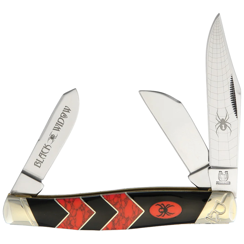 The “Black Widow” Stockman has three 440A stainless steel blades, one 3.25" clip point, one 2.25" sheepsfoot, and one 2.25" spey. The master blade has a detailed spiderweb and black widow spider etch. The pinched bolsters also feature a slant R design. Each blade opens with a match strike pull. Unlike a standard nail nick or long pull, a match strike pull has serrations inside the groove of the pull. These serrations allow you to strike a match with your knife. The blades use the half stops and slip joints found in traditional pocket knives.