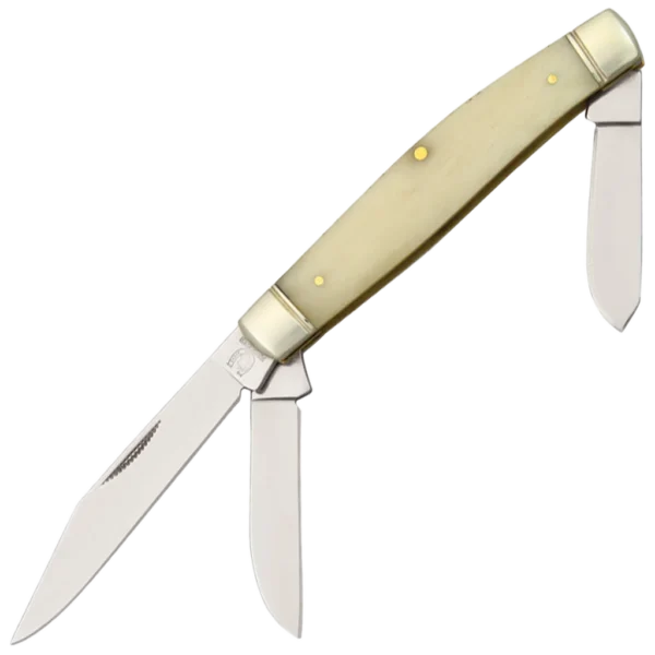3.75" closed. 440 stainless clip, spey, and sheepsfoot blades. White smooth bone handle. Nickel silver bolster(s). Boxed.