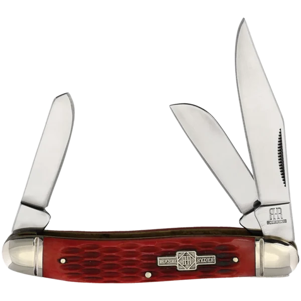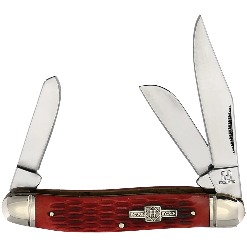 The Rough Ryder Stockman is a great everyday carry knife,with Red Jigged Bone Handle and 440A stainless steel blades. Features a 2″ spey blade. 2.25″ sheepsfoot blade. 3″ clip point blade. Measures 4" closed.