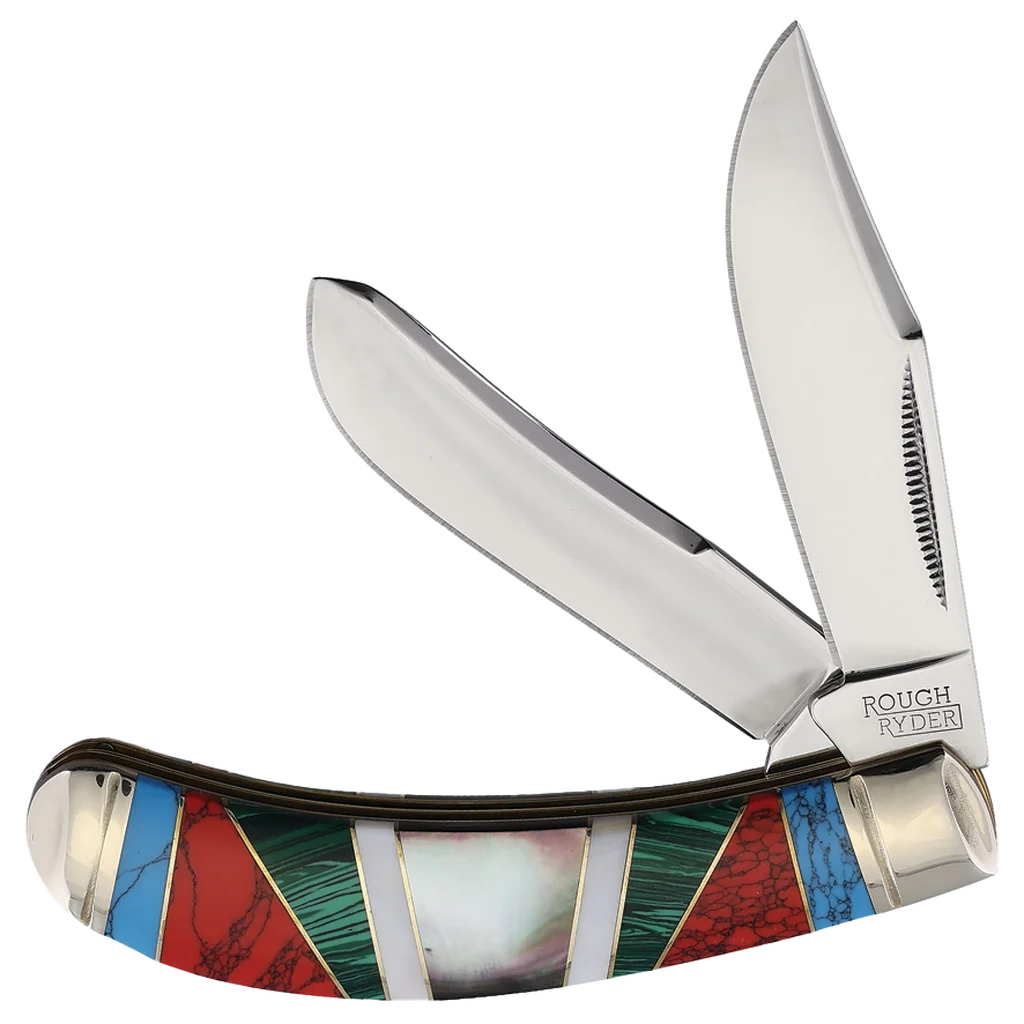 The Rough Ryder Stoneworx Bow Trapper Folding Knife is a striking example of craftsmanship, blending rugged durability with exquisite artistry. Designed for those who appreciate a functional tool that doesn’t compromise on aesthetics, this knife is a standout in the Rough Ryder Stoneworx series, known for its intricate handle designs and reliable performance. This Bow Trapper features two mirror-polished 440B stainless steel blades: a clip point and a spey blade. Both blades are engineered for precision and versatility, making this knife ideal for a wide range of tasks, whether you're out in the field or tackling everyday cutting needs. The blades are equipped with match strike pulls, offering smooth and effortless opening every time. What truly sets this knife apart is its handle. The Rough Ryder Stoneworx Bow Trapper showcases a stunning mosaic of cracked turquoise, Jasper, and agate synthetic stonework, accented with a genuine Mother-of-Pearl insert. This intricate design is not only visually captivating but also built to last, providing a durable grip that feels as good as it looks. The handle is further enhanced by nickel silver bolsters and spacers, which add a touch of elegance and strength, while brass liners offer additional durability and a warm, classic touch. At 4 inches closed and weighing 4 ounces, this Bow Trapper is the perfect size for a pocket knife—compact enough to carry comfortably, yet substantial enough to perform when you need it most.