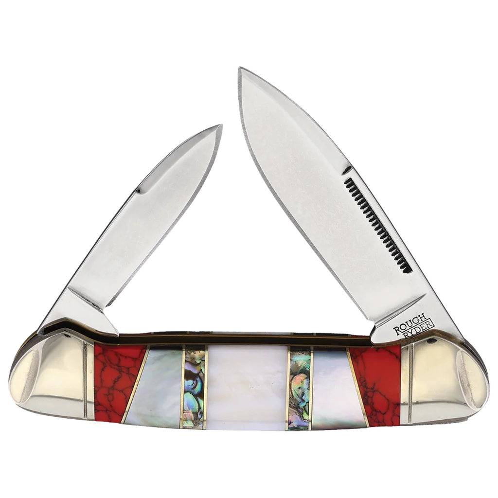 All the knives in the Rough Ryder Stoneworx Series feature mirror polished 440B stainless steel blades with match strike pulls. The handles are turquoise, jasper, and agate cracked synthetic stonework with brass liners and nickel silver bolsters. This Rough Ryder Stoneworx Canoe features two spear point blades. It's 3.5" closed and weighs 2.68oz.