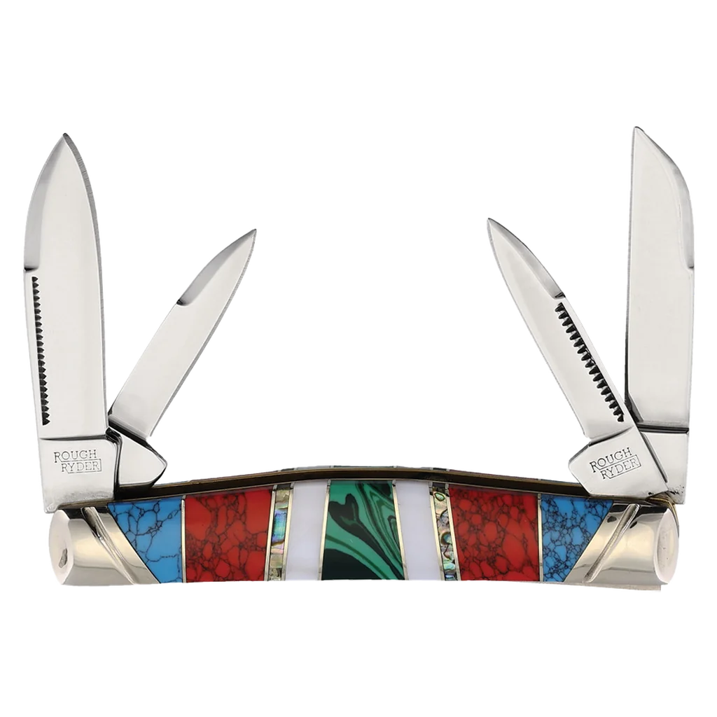 The Rough Ryder Stoneworx Congress features mirror polished 440B stainless steel Sheepsfoot, spey, and pen blades with match strike pulls. The handles are truly the heart of the Stoneworx Series. Crafted from cracked synthetic stonework, they boast intricate inlays of genuine Mother of Pearl and abalone, creating a stunning mosaic that’s both eye-catching and unique. The combination of these natural materials with the rugged synthetic stone gives the knife a look of timeless elegance and durability. Brass liners add strength and longevity, while the nickel silver bolsters enhance the knife's classic appeal, providing a perfect balance of beauty and brawn. It's 3.75" closed and weighs 3.1oz.