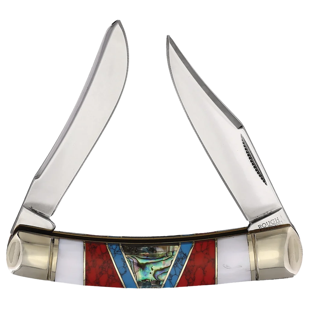 The Rough Ryder Stoneworx Large Moose Folding Knife is a masterful blend of artistry and functionality, designed for those who appreciate a tool that's as beautiful as it is effective. This knife is part of the Rough Ryder Stoneworx Series, known for its exquisite craftsmanship and eye-catching design. It features mirror-polished 440B stainless steel blades, renowned for their strength, edge retention, and corrosion resistance. The blades, one clip point and one skinner, are equipped with match strike pulls, ensuring a smooth and easy opening every time. Whether you're dressing game or handling everyday tasks, these blades are ready to perform with precision and reliability. The standout feature of the Stoneworx Large Moose is its handle, a true work of art. Crafted from cracked synthetic stonework, the handle showcases genuine Mother of Pearl and genuine pearl inserts, creating a striking contrast of colors and textures. The intricate design is complemented by nickel silver spacers and bolsters, adding both durability and a touch of elegance. Brass liners provide additional strength and structural integrity, ensuring that this knife is built to last. At 3.37 inches closed and weighing 8 ounces, the Rough Ryder Stoneworx Large Moose is compact enough to carry comfortably yet substantial enough to feel solid in hand. The combination of its size, weight, and construction makes it an ideal companion for both outdoor adventures and everyday use. Whether you're a collector of fine knives or someone who values high-quality tools, this knife is sure to impress with its blend of functionality and aesthetic appeal.