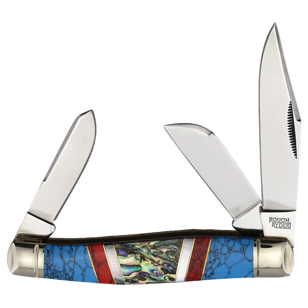 The Rough Ryder Stoneworx Large Stockman features mirror polished 440B Sheepsfoot, clip point, and spey blades with match strike pulls. The handles are truly the heart of the Stoneworx Series. Crafted from cracked synthetic stonework, they boast intricate inlays of genuine Mother of Pearl and abalone, creating a stunning mosaic that’s both eye-catching and unique. The combination of these natural materials with the rugged synthetic stone gives the knife a look of timeless elegance and durability. Brass liners add strength and longevity, while the nickel silver bolsters enhance the knife's classic appeal, providing a perfect balance of beauty and brawn. It's 4.12" closed and weighs 3.56oz.