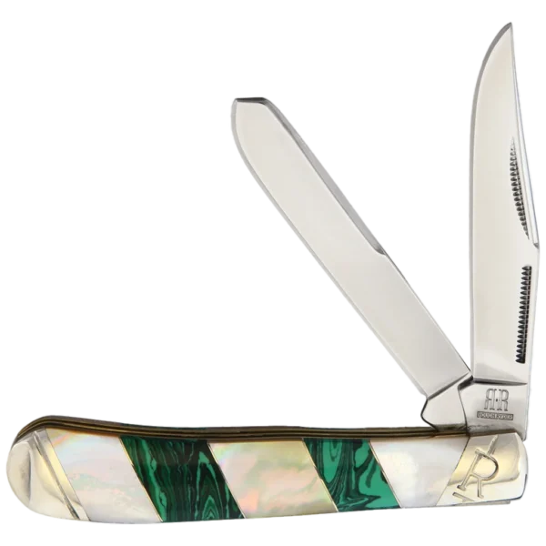 All the knives in the Rough Ryder Stoneworx Malachite and Pearl Series feature mirror polished 440A stainless steel blades with half stops and match strike pulls. The handles are malachite and pearl with brass liners, nickel silver spacers, and pinched nickel silver Slant R bolsters. This Rough Ryder Stoneworx Malachite and Pearl Trapper features clip point and spey blades. It's 4.12" closed and weighs 4oz.