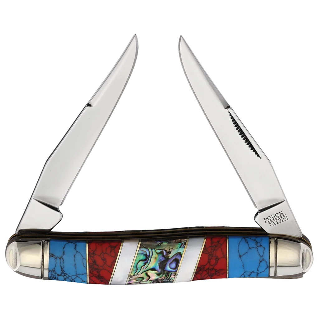 All the knives in the Rough Ryder Stoneworx Series feature mirror polished 440B stainless steel blades with match strike pulls. The handles are turquoise, jasper, and agate cracked synthetic stonework with brass liners and nickel silver bolsters. This Rough Ryder Stoneworx Muskrat features two clip point blades. It's 3.8" closed and weighs 2.86oz.