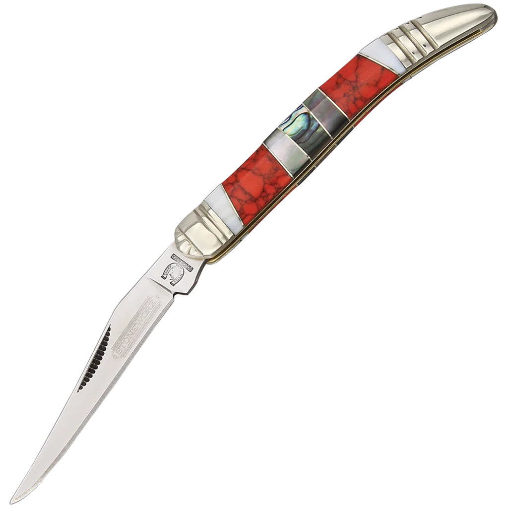 The Rough Ryder Stoneworx Small Toothpick Pocket Knife features a 2.25" 440A stainless steel clip-point blade with a satin finish. The handles are cracked synthetic jasper with genuine abalone and Mother of Pearl inlays, nickel silver spacers, brass liners, and embellished nickel silver bolsters. It's 3" closed and weighs an ounce.