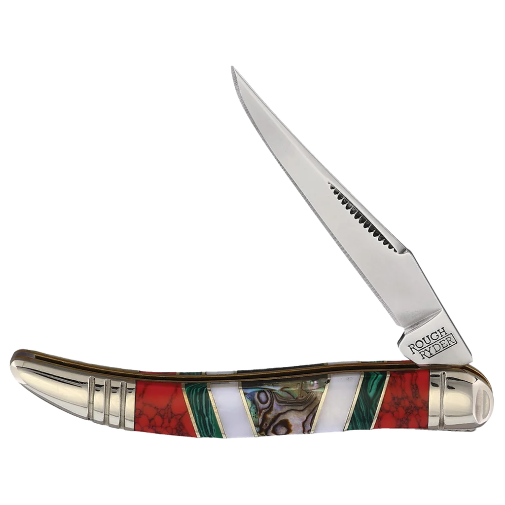 This knife is part of the Rough Ryder Stoneworx Series, known for its exquisite craftsmanship and eye-catching design. It features a mirror-polished 440B stainless steel blade, renowned for its strength, edge retention, and corrosion resistance. Crafted from cracked synthetic stonework, the handle showcases genuine Mother of Pearl and genuine pearl inserts, creating a striking contrast of colors and textures. The intricate design is complemented by nickel silver spacers and bolsters, adding both durability and a touch of elegance. Brass liners provide additional strength and structural integrity, ensuring that this knife is built to last.