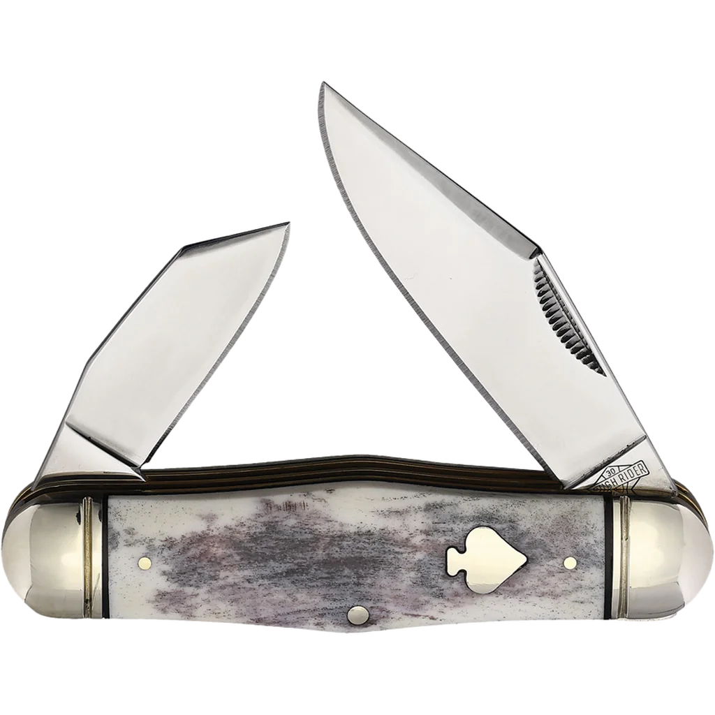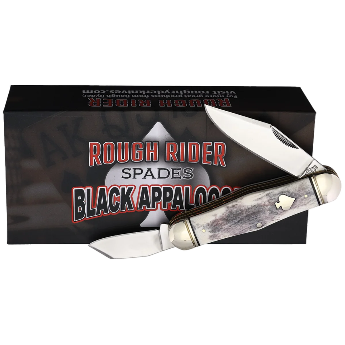 All the knives in Rough Ryder's new Black Appaloosa collection celebrate thirty years of Rough Ryder knives! This Swell Center Jack features mirror-polished stainless steel clip point and Wharncliffe blades with a match strike pull. The smooth bone handles are a nod to the traditional materials that have been used in knife-making for centuries, while the unique coloration sets this knife apart from the rest. The ringed nickel silver bolsters add a touch of sophistication, reinforcing the knife's structure and enhancing its visual appeal. A special feature of this anniversary edition is the spade-shaped nickel silver shield, which not only commemorates Rough Ryder's 30 years of excellence but also serves as a distinctive emblem of the brand's commitment to quality. The knife is further reinforced with brass liners and nickel silver pins, ensuring a sturdy and reliable construction that will stand the test of time. It's 3.63" closed – compact enough to fit comfortably in your pocket, yet substantial enough to handle daily tasks with confidence.