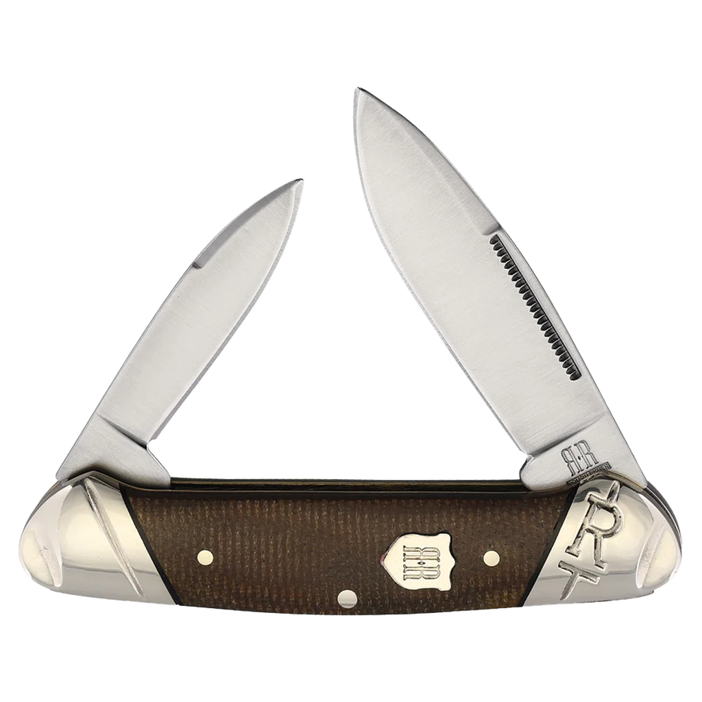 All the knives in the Rough Ryder Tater Skin Brown Burlap Series feature 440 stainless steel blades with nail nick pulls and a satin finish. The handles are brown burlap micarta deliciously reminiscent of a warm baked potato. This Canoe folder has a 2.5" spear point and 2.25" pen blade. It's 3.5" closed and weighs 2.7oz.