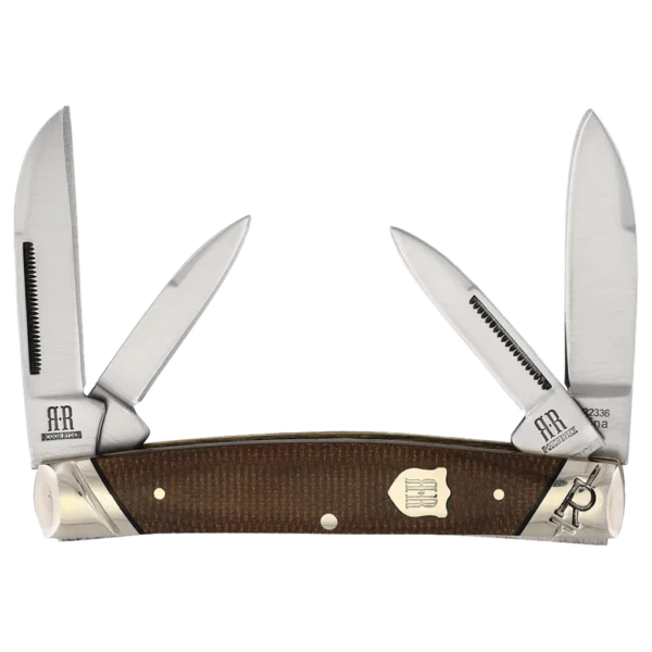 All the knives in the Rough Ryder Tater Skin Brown Burlap Series feature 440 stainless steel blades with nail nick pulls and a satin finish. The handles are brown burlap micarta deliciously reminiscent of a warm baked potato. The Congress features spear point, Sheepsfoot, and pen blades ranging from 2.25" – 2". It's 3.75" closed and weighs 2.9oz.