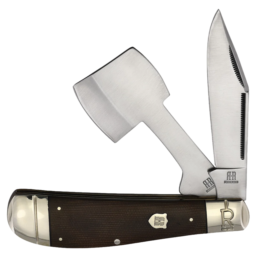 All the knives in the Rough Ryder Tater Skin Brown Burlap Series feature 440 stainless steel blades with nail nick pulls and a satin finish. The handles are brown burlap micarta deliciously reminiscent of a warm baked potato. The Pocket Chopper features a 3.25"clip point blade and a mini tomahawk with a cutting edge of 1.5". It's 5" closed and weighs 7.97oz.