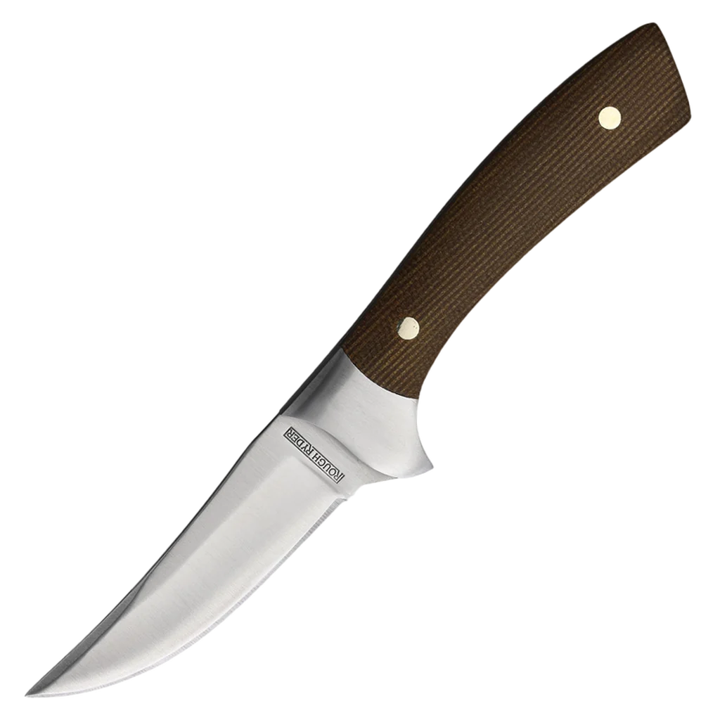 All the knives in the Rough Ryder Tater Skin Brown Burlap Series feature 440 stainless steel blades with a satin finish. The handles are brown burlap Micarta deliciously reminiscent of a warm baked potato. This Rough Ryder Tater Skin Brown Burlap Wolverine has a 3" blade. It's 7" overall and weighs 10.1oz. Includes a black nylon sheath