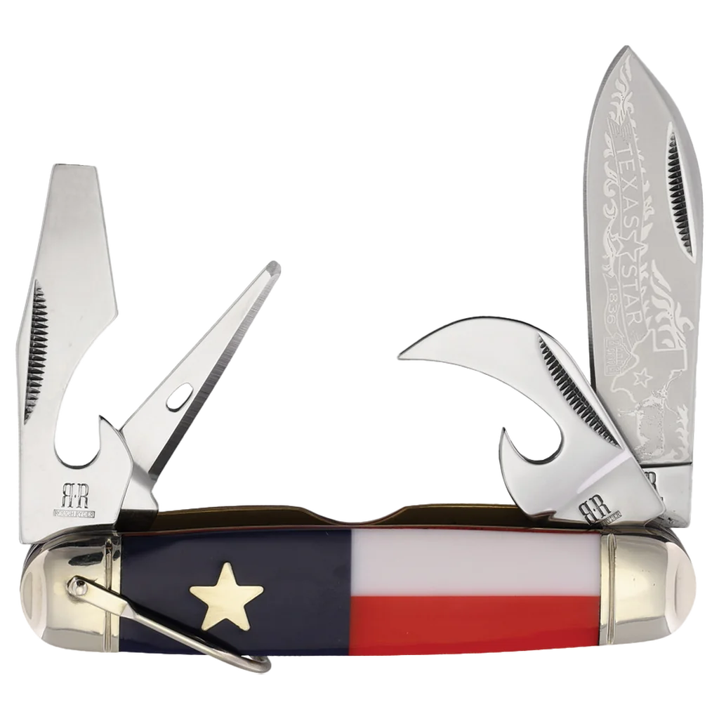 All the knives in Rough Ryder's new Texas Star Series feature stainless steel blades with frosted Texas blade celebrations! Each has red, white, and blue synthetic handles with ringed nickel silver bolsters, brass liners, and a Texas Star shield. This Rough Ryder Texas Star Camp Knife has a drop point blade, can and bottle openers, an awl, a reamer with a sewing eye, and a stainless steel lanyard bail. It's 4.12" closed and weighs 5.6oz