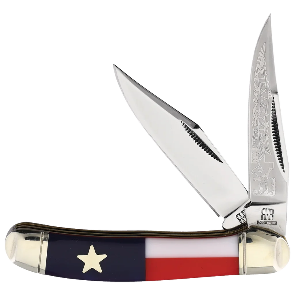 The Rough Ryder Texas Star Copperhead Folding Knife embodies the spirit of the Lone Star State with a bold, patriotic design and dependable functionality. Part of the Texas Star Series, this knife features two sharp clip point blades made from mirror-polished 440 stainless steel. The polished finish gives these blades a brilliant sheen while also protecting against rust and wear. Each blade is equipped with match strike pulls for easy opening, and the master blade showcases an etched "Texas Star" embellishment, highlighting its prideful roots. Whether you're slicing through rope, carving wood, or tackling everyday tasks, these blades are built to perform with precision and reliability. The handle of the Texas Star Copperhead is where the knife truly shines. Crafted from red, white, and blue resin, the handle reflects the colors of the Texas flag, making a statement wherever you carry it. The nickel silver lone star inlay is a tribute to Texas heritage, adding a touch of rugged elegance to the design. Brass liners offer a solid, sturdy frame, while nickel silver pins and pinched nickel silver bolsters provide both strength and a touch of refined detail. This combination of materials ensures that the knife is not only visually appealing but also durable enough to withstand years of use. At 3.75 inches closed and weighing 4 ounces, this folding knife strikes a balance between portability and functionality.