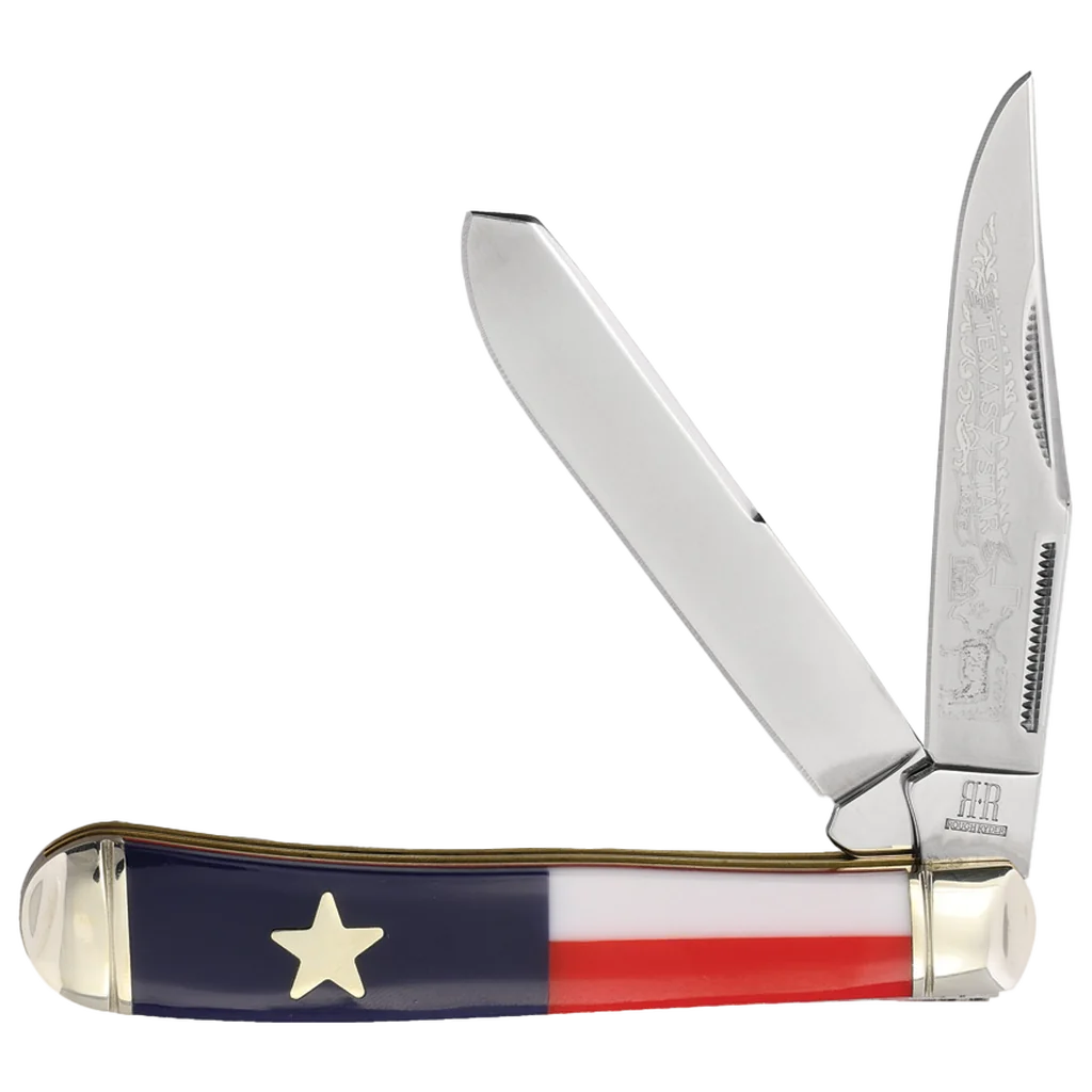 Whether you're looking for a collectible or EDC pocket knife, The Rough Ryder Trapper Texas Star is an excellent choice. It features 2.87" mirror-polished stainless steel clip point and spey blades with frosted embellishments on the clip point. It opens with ambidextrous match strike pulls. The handles are made of red, white, and blue synthetic with brass liners and ringed nickel silver bolsters. The Texas Star shield is a striking accent on this handsome knife. This Rought Ryder pocket knife knife is perfect for everyday carry. It's small enough to fit in your pocket, but it's big enough to handle any task you need it to. The ambidextrous match strike pulls make it easy to use for both left-handed and right-handed users.
