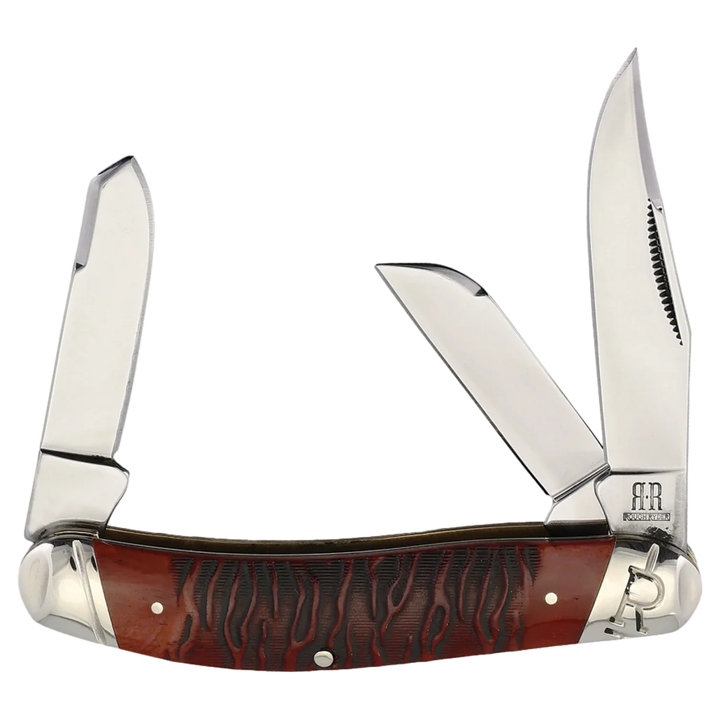 The Rough Ryder Tiger Stripe Sowbelly blends striking aesthetics with dependable performance. This folding knife is equipped with three versatile blades—a clip point, a spey, and a Sheepsfoot—crafted from 440A stainless steel. Each blade is mirror polished for a sleek finish and features nail nick pulls for easy access, ensuring you're prepared for any task that comes your way. The handle of the Tiger Stripe Sowbelly is made from jigged amber bone, adorned with a distinctive tiger stripe pattern that sets it apart from ordinary knives. This rugged yet elegant handle is complemented by nickel silver pins, providing both durability and a touch of refinement. Brass liners add structural integrity, while the embossed nickel silver bolsters enhance the overall look and feel, making this knife a true standout. Measuring 3.75 inches when closed and weighing 2.6 ounces, this Sowbelly knife is designed for comfortable carry and reliable use.