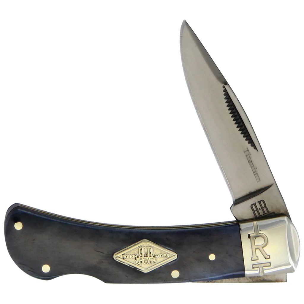The Rough Ryder Black Smooth Bone Lockback features a 2.25" 440A stainless steel blade with a match strike pull and a tough-as-nails titanium nitride coated finish. This lockback has black smooth bone handles with brass liners, nickel silver pins and bolsters, and a diamond-shaped nickel silver Rough Ryder shield. It's 3.12" closed.