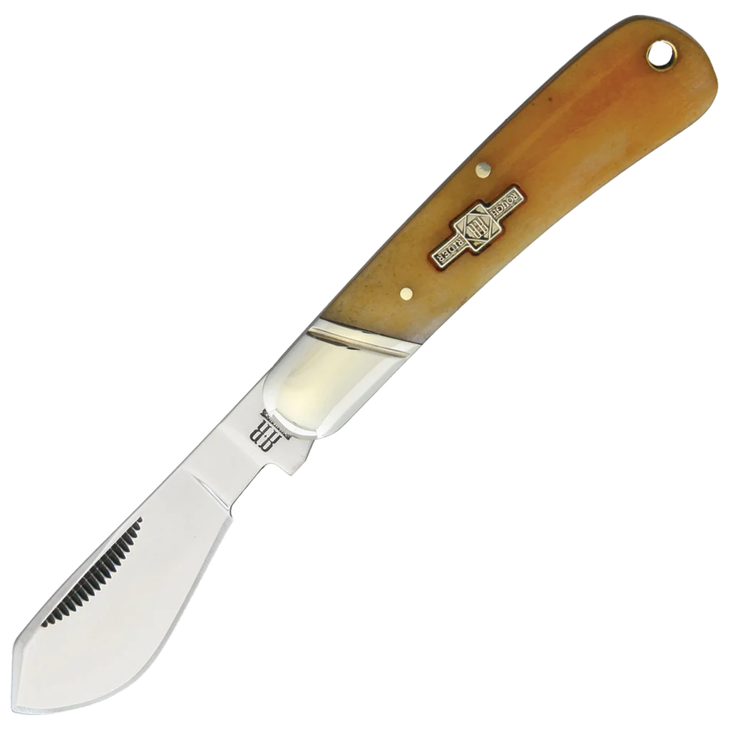 The Rough Ryder Tobacco Bone Small Cotton Sampler Folding Knife is a compact and versatile tool, crafted with the precision and care that Rough Ryder is known for. At its heart is a 1.9-inch blade made from 440A stainless steel, a material that offers excellent corrosion resistance and edge retention. The blade's design, originally created for testing cotton, makes it well-suited for a variety of tasks that require careful cutting and slicing. With the match strike pull and half stop, the blade opens smoothly and securely, adding to the knife’s classic feel. The handle of this small cotton sampler is crafted from tobacco smooth bone, giving it a rich, earthy appearance that stands out without being overstated. Nickel silver pins and ringed nickel silver bolsters further enhance the knife’s durability, offering a strong and reliable framework. A lanyard hole at the end of the handle provides additional utility, allowing you to easily attach the knife to gear or a keychain for quick access.