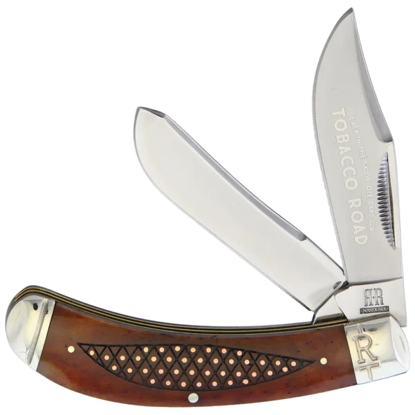 All the knives in the Rough Ryder Tobacco Road Series feature mirror polished 440A stainless steel blades with reverse frosted master blade etches and match strike pulls. The handles are tobacco bone with copper nailhead accents, nickel silver pins, brass liners, and pinched nickel silver bolsters. The Tobacco Road Bow Trapper features classic penknife styling and top quality manufacture. There are two blades; one clip and one spey, measuring 3.25" and 3.27", when closed the knife measures 4.125".