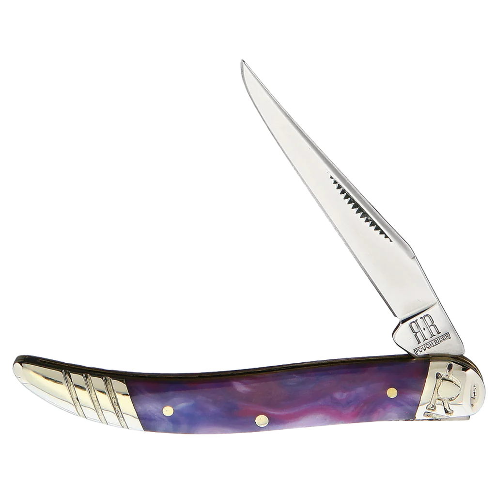 The Rough Ryder Toothpick pocket knife combines tradition with functionality, making it an ideal companion for daily use. This slip joint knife features a sleek, long design rooted in history yet fully equipped for today's tasks. All the knives in the Rough Ryder Purple Swirl Series feature mirror polished 440A stainless steel blades with and match strike pulls and half stops. The handles are purple swirled composition with brass liners, nickel silver pins, and nickel silver slant 'R' bolsters.