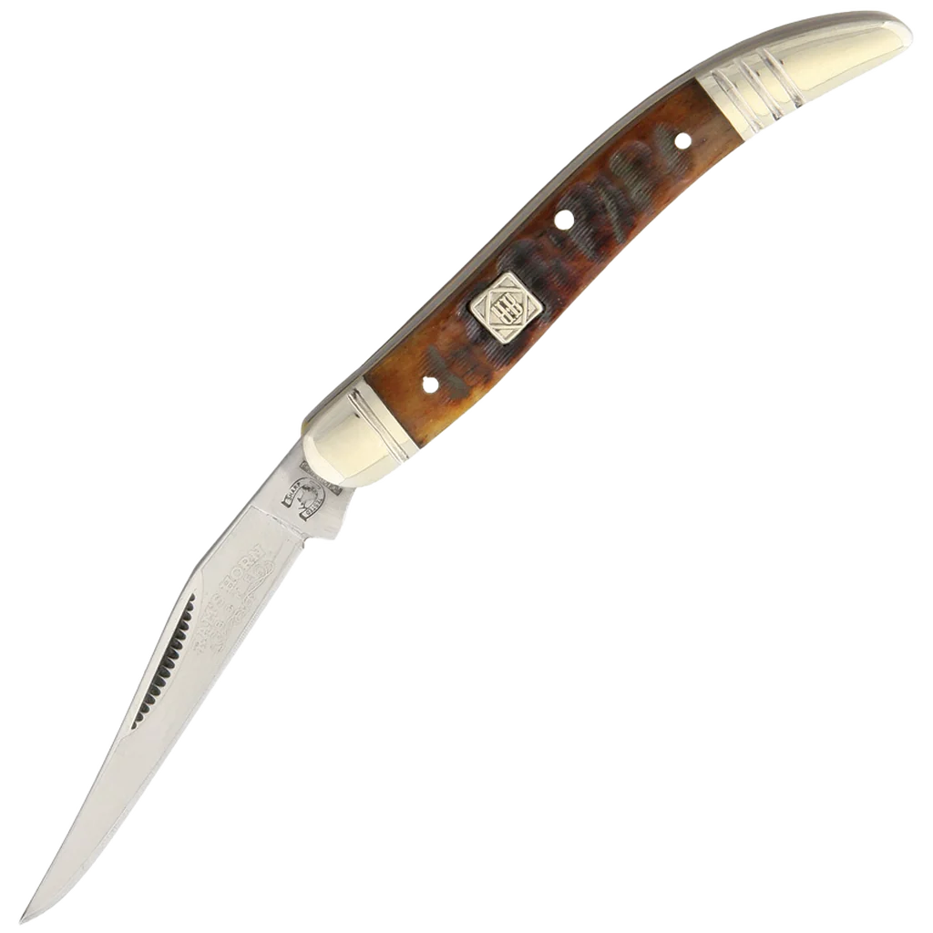 The Rough Ryder Rams Horn Bone Small Toothpick is a striking blend of traditional craftsmanship and functional beauty, built for those who appreciate a knife that performs as well as it looks. This folding knife features a mirror-polished 440A stainless steel clip point blade. The mirror-polished finish not only enhances the blade’s aesthetic but also improves corrosion resistance, ensuring this knife will stand the test of time. The clip point blade is etched with a reverse frosted “Ram’s Horn Bone” logo, a nod to the unique material that makes this knife a standout in any collection. The handle is crafted from genuine ram’s horn bone, giving the knife a natural, rugged appeal that sets it apart from more common handle materials. Each handle has its own unique texture and pattern, making every knife one-of-a-kind. The warm, earthy tones of the ram’s horn bone handle are complemented by brass liners that provide added strength and durability. Nickel silver pins secure the handle to the frame, while the nickel silver bolsters add a touch of elegance to the knife’s overall design. The classic Rough Ryder nickel silver shield on the handle completes the look, making this knife a perfect blend of function and style.