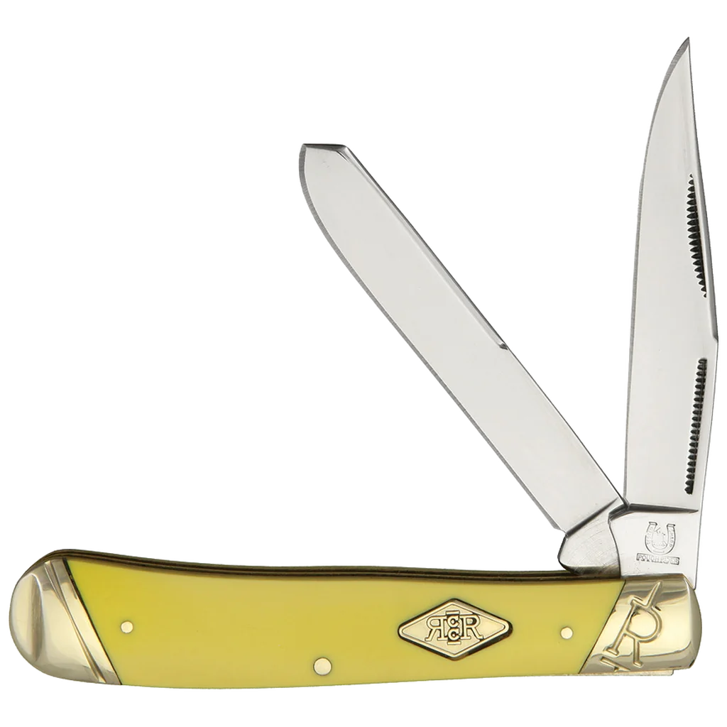 Rough Ryder trapper with a yellow smooth synthetic handle. Made with T10 carbon steel it has a 3.27" clip and 3.25"spey blade with a closed length of 4.13″. The trapper has a pinched and lined nickel silver bolster with an inlay shield.