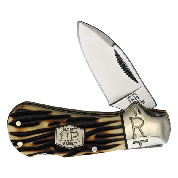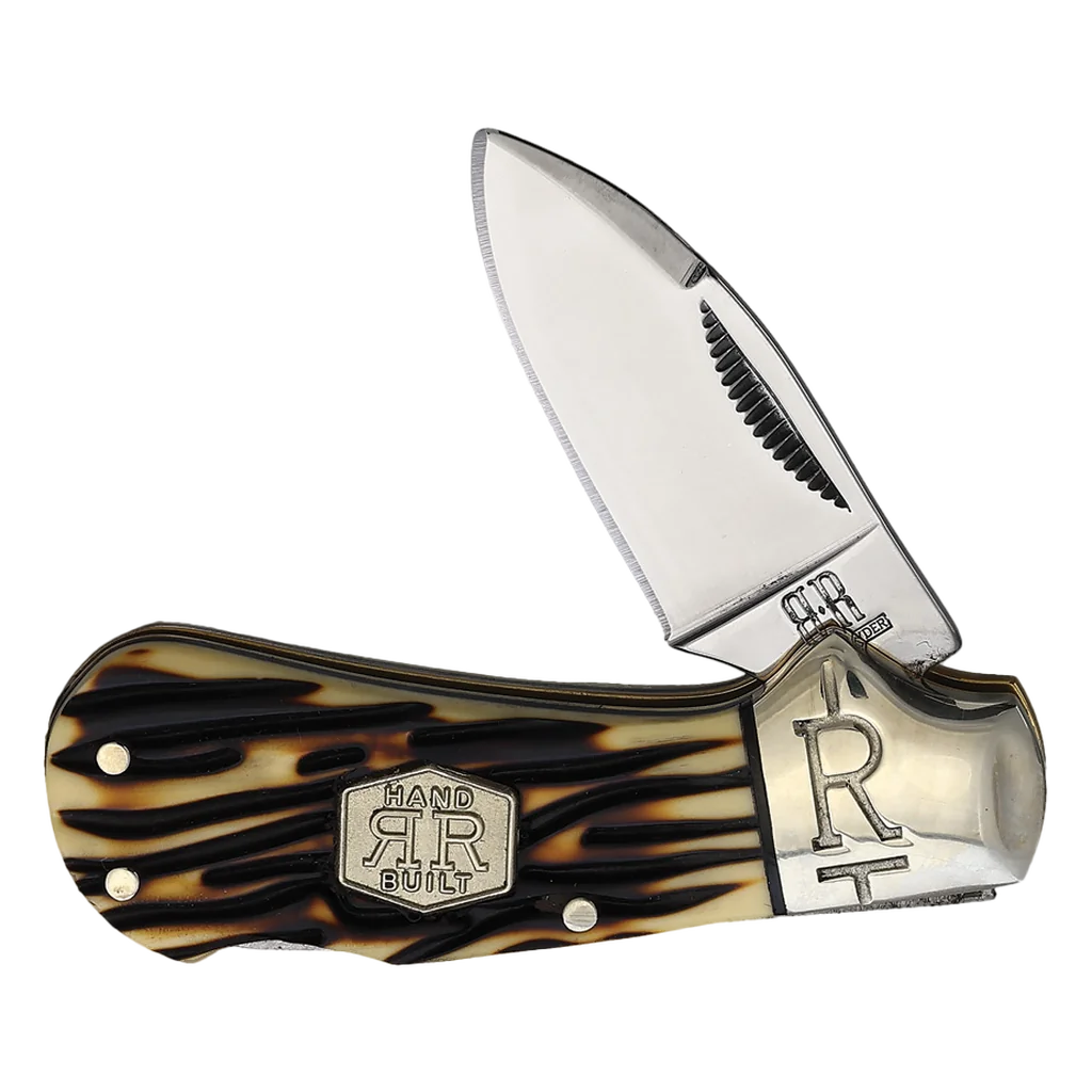 All the knives in the Rough Ryder Tuff Stag Series feature 440A stainless steel blades with a silky satin finish. The handles are Tuff Stag synthetic with brass pins and liners, embossed nickel silver Slant R bolsters, and a nickel silver RR shield. This Rough Ryder Tuff Stag Cub Lockback has a 1.62" drop point blade with a sturdy back lock. It's 2.5" closed and weighs 1.92oz.