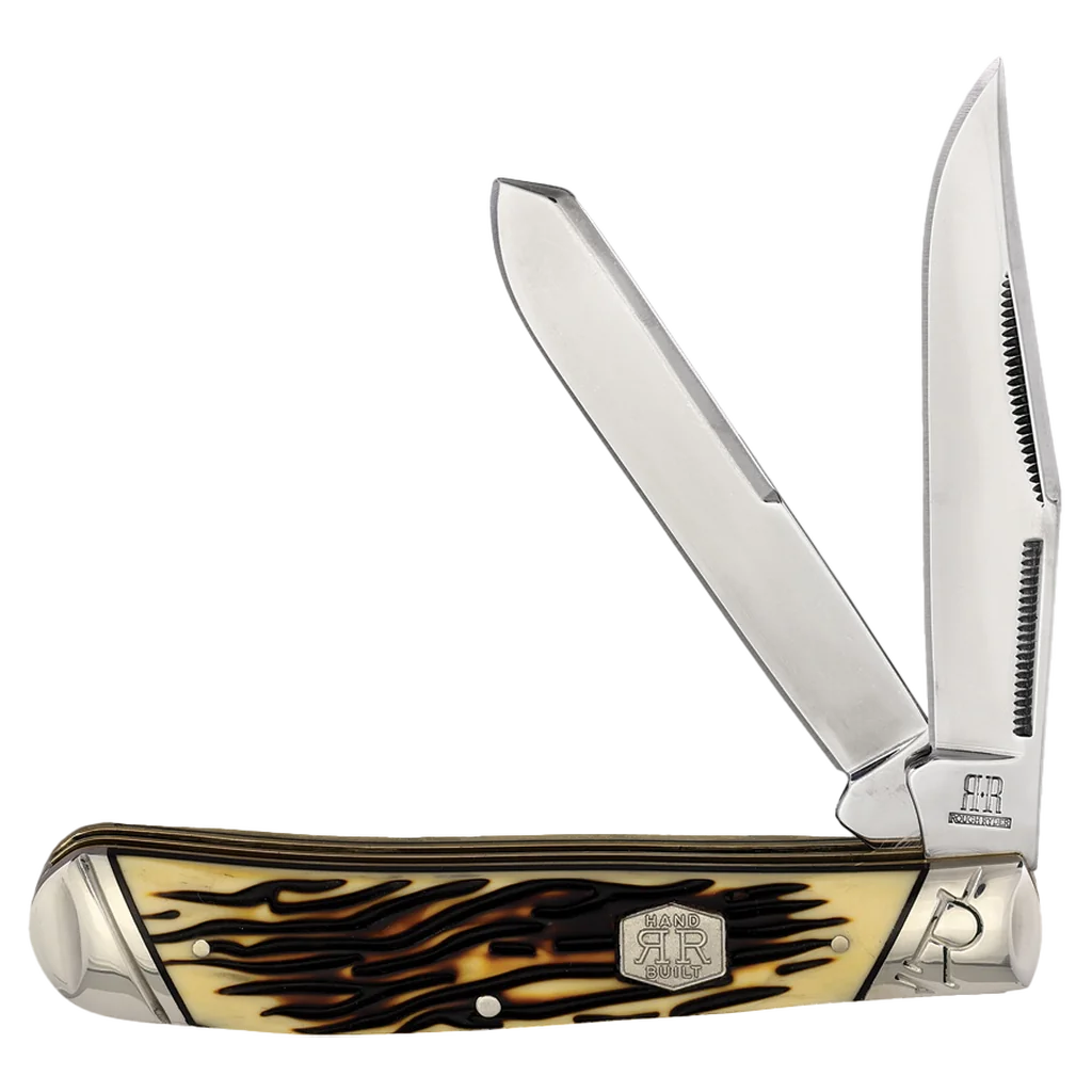 All the knives in the Rough Ryder Tuff Stag Series feature 440A stainless steel blades with a silky satin finish. The handles are Tuff Stag synthetic with brass pins and liners, embossed nickel silver Slant R bolsters, and a nickel silver RR shield. This Rough Ryder Tuff Stag Trapper has clip point and spey blades. It’s 4.12" closed and weighs 4oz.