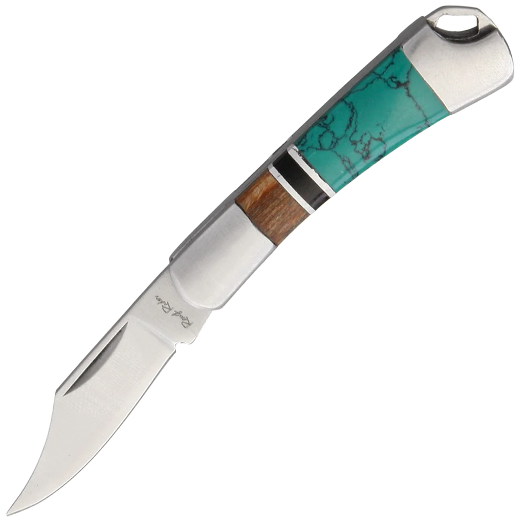 The Rough Rider Mini Pocket Knife is a traditional pocket knife for everyday carry. The 440A stainless steel, clip point blade has a satin finish and nail nick opener. The handle is made of faux turquoise and brown wood with a black polymer trim. It features stainless steel bolsters with a lanyard/keyring loop. Like most traditional pocket knives, it has a slip joint.