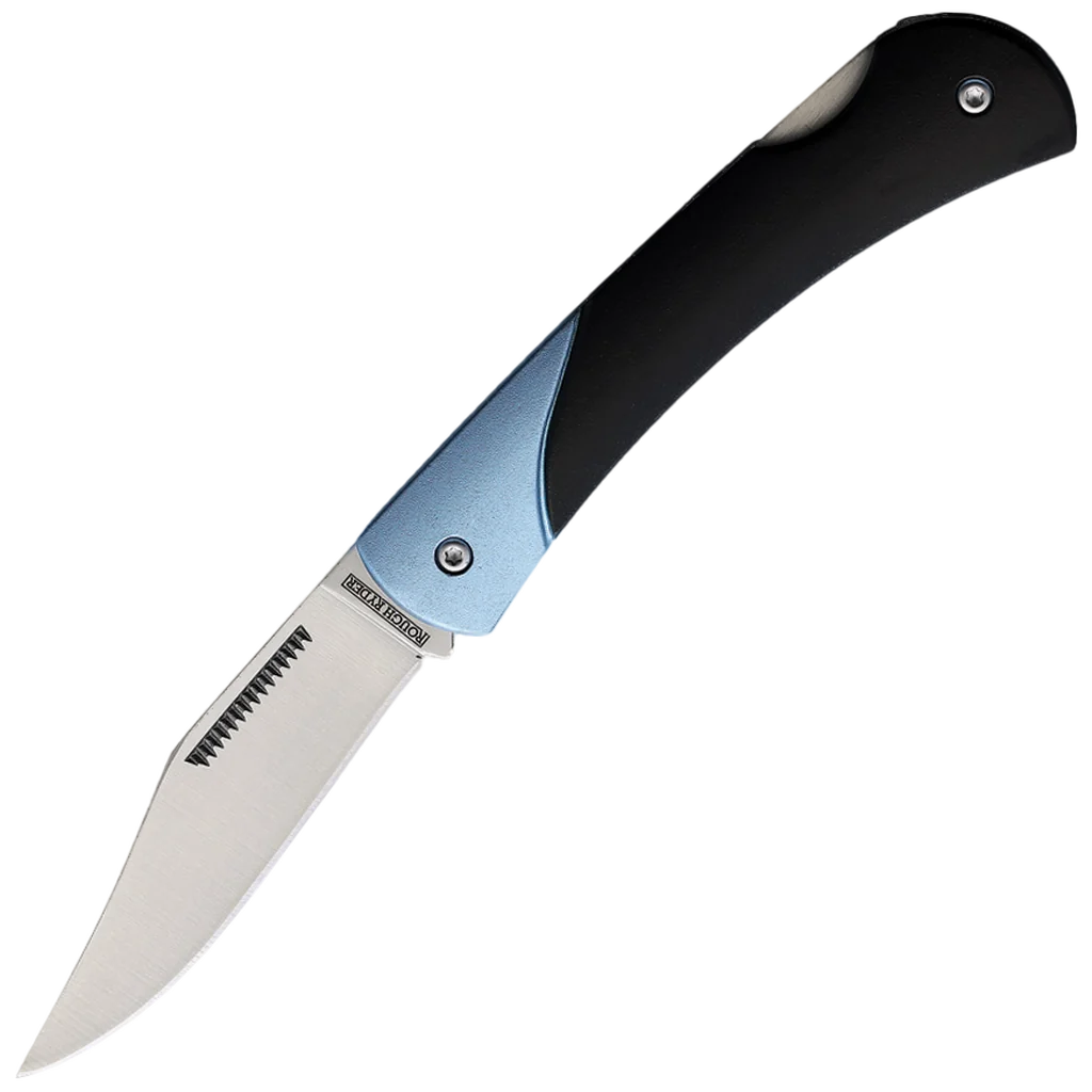 The Rough Ryder VG-10 Lockback Folding Knife (Black and Blue) is a perfect blend of cutting-edge technology and timeless craftsmanship, making it an essential tool for those who demand precision and reliability in their everyday carry. This knife is crafted with Rough Ryder's dedication to quality, ensuring it meets the rigorous standards that knife enthusiasts have come to expect. At the heart of this knife is the 2.5" VG-10 clip point blade, known for its exceptional sharpness, edge retention, and corrosion resistance. The blade's brushed satin finish not only adds a touch of elegance but also enhances its durability, making it a reliable tool for various tasks. The clip point design is ideal for detailed work, making it a versatile option for everyday use. With a match strike pull, opening the blade is smooth and effortless, while the sturdy back lock ensures it stays securely in place during use, providing confidence in every cut. The handle of the VG-10 Lockback is where form meets function. Constructed from durable black and blue aluminum, the handle offers a striking contrast that’s both visually appealing and practical. The aluminum construction provides a lightweight yet sturdy grip, making the knife comfortable to hold during prolonged use. The stainless steel pivot pin and liners add to the knife's overall durability, ensuring it can withstand the rigors of daily use. The lanyard hole offers additional versatility, allowing you to easily attach the knife to your gear or carry it in a way that suits your needs. Measuring 3.5" closed and weighing just 2 ounces, this knife is incredibly portable, making it easy to carry in your pocket or pack without adding unnecessary bulk. Despite its compact size, the VG-10 Lockback delivers a solid performance, making it a dependable companion whether you're tackling everyday tasks or facing more demanding situations.