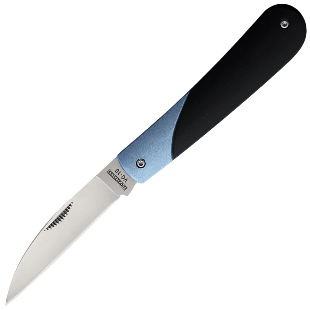 The Rough Ryder VG-10 Wharncliffe Slip Joint Folding Knife combines the precision of a Wharncliffe blade with premium materials to deliver a knife that's as functional as it is striking. The 2.75" VG-10 stainless steel blade offers outstanding sharpness and durability, ensuring that this knife can handle everything from fine slicing tasks to tough cutting jobs. The Wharncliffe blade shape is renowned for its utility in everyday use, with a straight edge that excels in both precision cuts and heavier tasks. Finished with a satin polish and featuring a match strike pull, the blade is as elegant as it is practical. The knife's handle is a standout feature, with a sleek combination of black and blue aluminum that not only looks great but provides excellent grip and durability. The use of aluminum keeps the knife lightweight while maintaining toughness, making it comfortable to carry and use for extended periods. The stainless steel backsprings, screws, and liners add to the knife's overall sturdiness, ensuring it can handle the rigors of daily use without fail. At 4" closed and weighing in at just 3.1 ounces, the Rough Ryder VG-10 Wharncliffe Slip Joint is compact enough to slip into your pocket, but substantial enough to give you the confidence of a well-crafted tool in your hand. This slip joint knife is designed for those who appreciate the craftsmanship of a traditional folding knife but with modern upgrades. The VG-10 steel offers superior edge retention and corrosion resistance, making it a reliable companion in any environment, whether you’re at the job site, in the great outdoors, or just tackling everyday tasks. The slip joint mechanism provides smooth, reliable action without the need for a locking mechanism, keeping the knife simple and straightforward while still delivering dependable performance.
