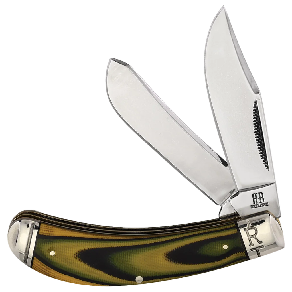 All the knives in the Rough Ryder Wasp Series feature VG-10 stainless steel blades with nail nick pulls and a satin finish. The handles are yellow and black G-10 with brass liners, black underliners, nickel silver pins, and embossed nickel silver Slant R bolsters. The Wasp Bow Trapper has a 3.27" clip point and 3.25" spey blade. It's 4.12" closed and weighs 4oz. The knife closes with a slip joint non-locking system.