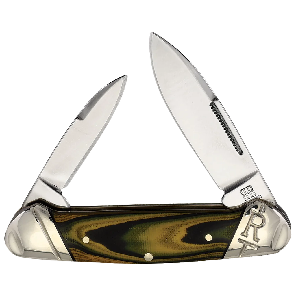 All the knives in the Rough Ryder Wasp Series feature VG-10 stainless steel blades with nail nick pulls and a satin finish. The handles are yellow and black G-10 with brass liners, black underliners, nickel silver pins, and embossed nickel silver Slant R bolsters. The Rough Ryder Wasp Canoe has 2.6" spear point and 1.97" pen blade. It's 3.62" closed and weighs 2.9oz.