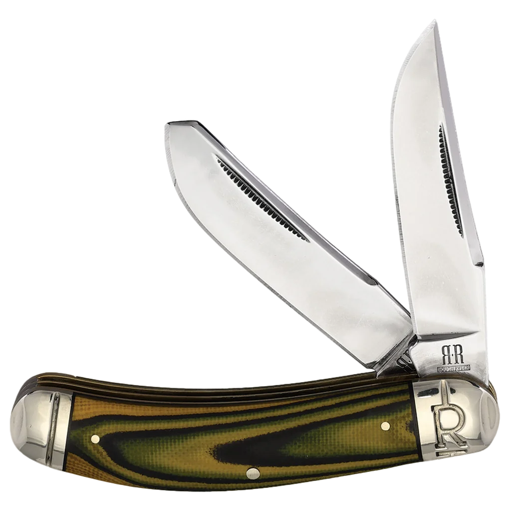 All the knives in the Rough Ryder Wasp Series feature VG-10 stainless steel blades with nail nick pulls and a satin finish. VG-10 is a premium steel known for its exceptional edge retention, corrosion resistance, and overall toughness, while the satin finish reduces glare and resists wear on the blade. The handles are yellow and black G-10 with brass liners, black underliners, nickel silver pins, and embossed nickel silver Slant R bolsters. The Wasp Large Sowbelly Trapper has 2.62" non-locking clip point and skinner blades. It's 3.75" closed and weighs 3.92oz.