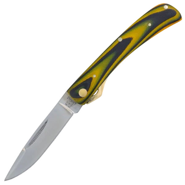 All the knives in the Rough Ryder Wasp Series feature VG-10 stainless steel blades with nail nick pulls and a satin finish. VG-10 is a premium steel known for its exceptional edge retention, corrosion resistance, and overall toughness, while the satin finish reduces glare and resists the appearance of wear on the blade. The handles are yellow and black G-10 with brass liners, black underliners, nickel silver pins, and embossed nickel silver Slant R bolsters. The Wasp Linerlock has a a 2.62" locking drop point blade. It's 3.5" closed and weighs 2.08oz.