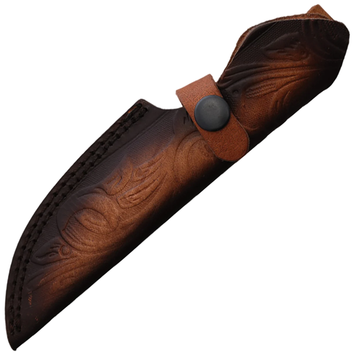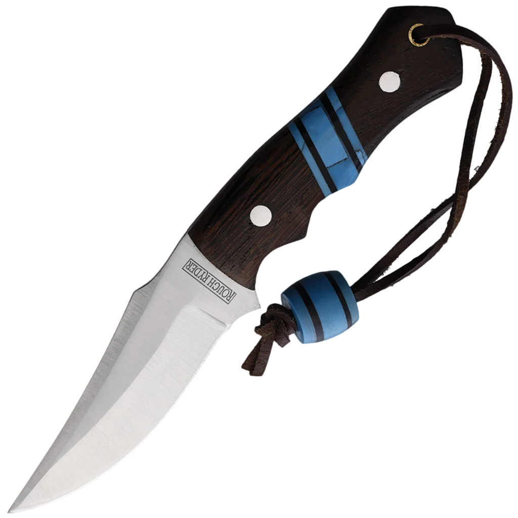 The Rough Ryder Wenge Wood and Stonework Fixed Blade Hunting Knife features a 3.75" stainless steel clip-point blade with a satin finish. This full-tang fixed blade has a smooth Wenge wood handle with a cracked synthetic turquoise insert, stainless steel pins, a brass lanyard tube, and a leather cord lanyard with a cracked synthetic turquoise bead. It's 8" overall. Includes a brown leather sheath with a belt loop.