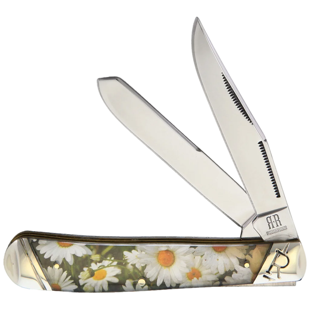 All the knives in the Rough Ryder Wild Flowers Series feature mirror polished 440A blades with half stops and nail nick pulls. The handles are acrylic with full color floral art, nickel silver pins, brass liners, and embossed nickel silver bolsters. The Rough Ryder Daisy Trapper consists of two non-locking blades – a Clip point and Spey blade. When closed the knife measures 4.12".